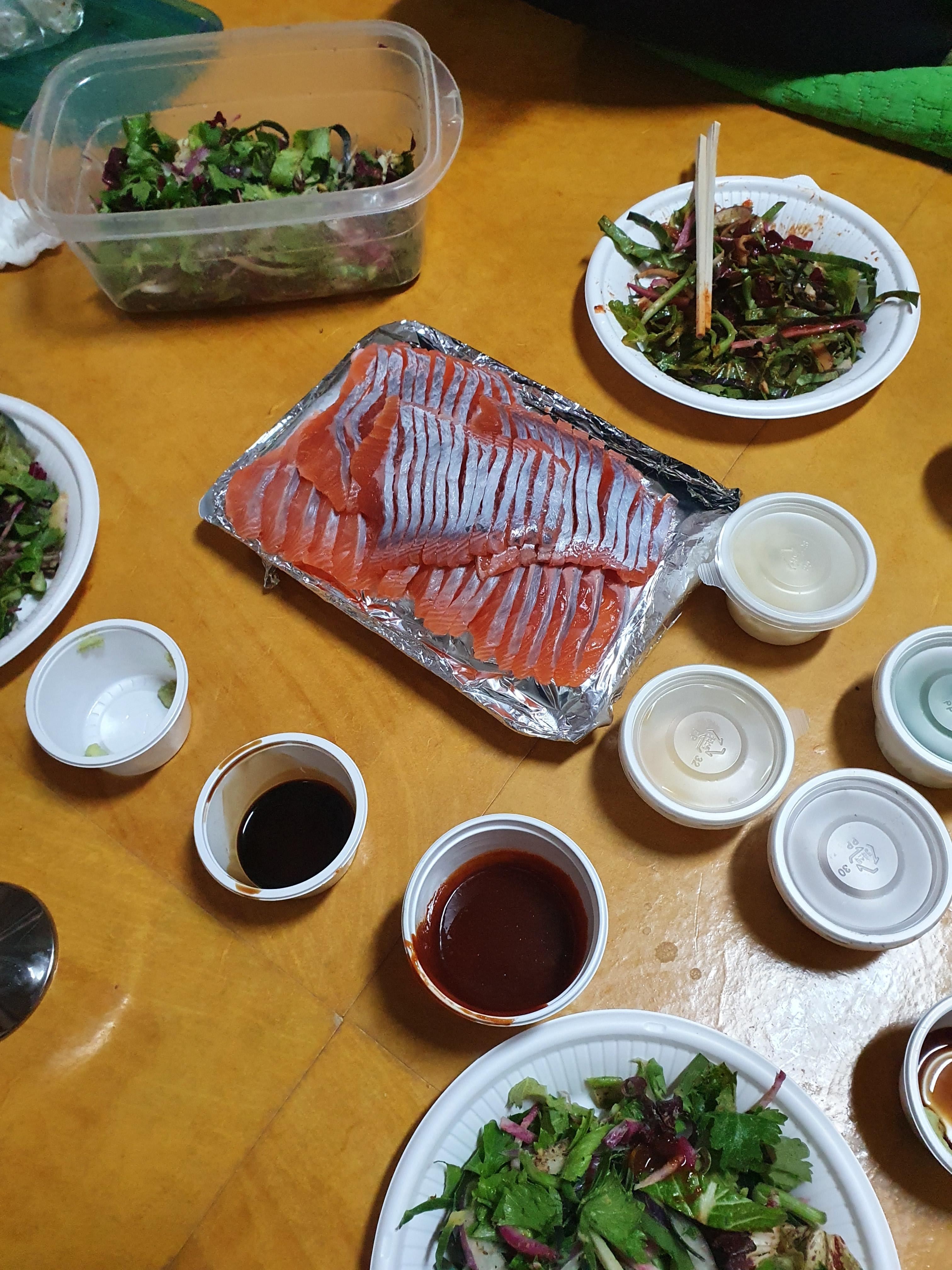 우리는 셋이서 향어 백숙, 돼지 조림, 각자 밥 한공기에 반주까지 완전 코스 느낌으로 먹었다. (송어 비빔회는 포장..ㅎ)